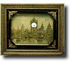 Musical picture clock with balance wheel escapement and musical movement. Picture in glazed frame with corner features - 29"x24". German c1900