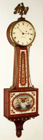 Foster Campos, Pembroke, Mass, "Patent or Banjo" time piece with 8 day, weight driven movement in banded and inlaid mahogany case with reverse painted tablets, signed on the movement, case, dial and weight. Dated number 10 of the year 1985.