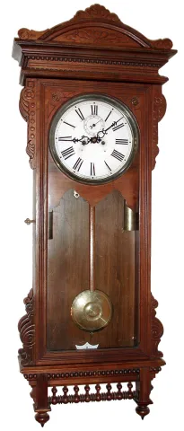 Waterbury Clock Co., Waterbury, Conn., "Regulator No. 57" wall time piece, 8 day, time only, 2 weight driven movement in walnut case with painted metal dial and second's bit, c1905