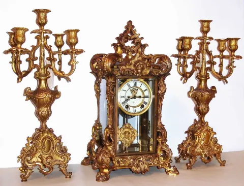 ticking briskly. The gilded case and candelabra have some slight darkening. The dial has one hairline in the center. Please note the unique pendulum u...