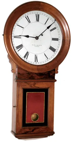 E. Howard and Co., Boston, Mass., "Regulator No. 70" wall time piece, 8 day, time only, weight driven movement in black walnut case with reverse painted lower tablet and painted metal dial, c1900