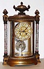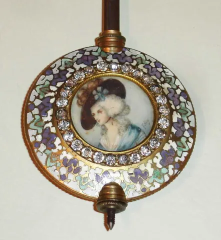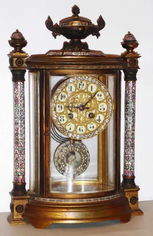 French oval crystal regulator mantel clock, 8 day, time and strike, spring driven movement in brass and multicolor enamel case with bejeweled pendulum inset with artist signed portrait of an aristocratic woman and bejeweled dial surround, c1890