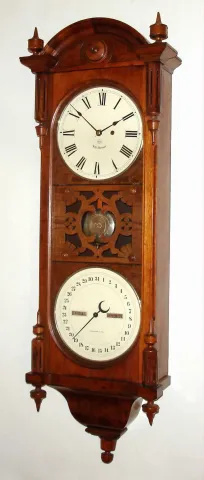 Seth Thomas Clock Co., Thomaston, Conn., "Office Calendar No. 10" earlier version with fret work between the two dials, 8 day, time and perpetual calendar, weight driven movement in walnut case similar to the "Regulator No. 6" with painted metal double di