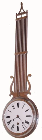 French mystery clock, "La Balancelle" double dialed shop window regulator 8 day, time only, spring driven movement in nickel plated grid iron pendulum form case with two white enamel dials, one with sweep seconds and the other without, c1850