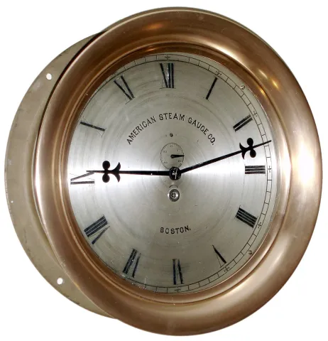 E. Howard and Co., Boston, Mass., "No. 69 Marine or Locomotive Clock" for the American Steam Gauge Co., Boston, 8 day, time only, spring driven movement with lever escapement in brass case with 12" silvered dial signed with s#116111, c1889