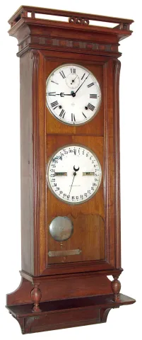 Seth Thomas Clock Co., Thomaston, Conn., "Suez" perpetual calendar wall clock, 8 day, time and strike, spring driven movements in a walnut case with painted metal double dial, c1886