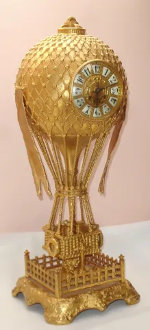 French, Large Cast and gilt bronze Balloon Clock, the case depicting a hot air balloon with a woven basket below, and is anchored to the ground within a fenced platform. Has a gold dore finish. Dial has applied Arabic numerals and fancy black hands; typic