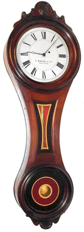 E. Howard and Co., Boston, Mass., "Regulator No. 7" time piece, 8 day, time only, weight driven movement in walnut case with reverse painted tablets and painted metal dial, c1874
