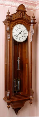 Seth Thomas Clock Co., Thomaston, Conn., "REGULATOR No. 19", in walnut with burled appliques, wall regulator with 2- jar compensating pendulum, weight driven and with center seconds hand, c1885