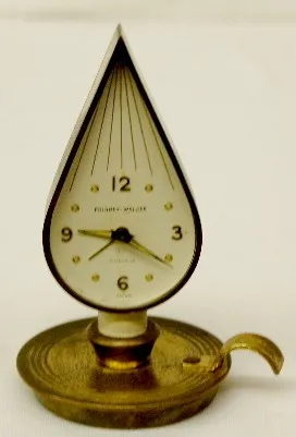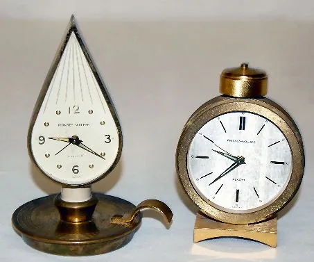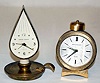 1.) Metal dial; candle holder and flame shape; 7 jewels. (Wear to finish.) 2.) Metal dial; round cap shape. (Neither clock is running.) 5 1/2"...
