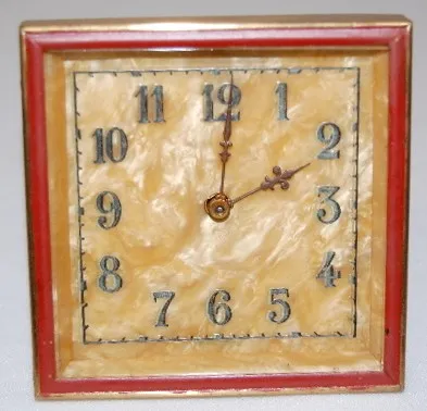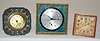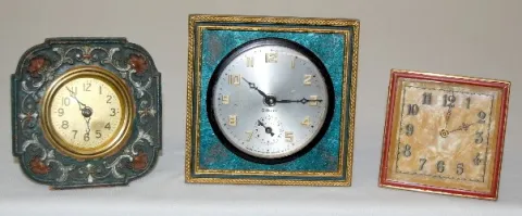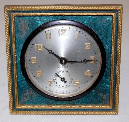 1.) National, white metal floral frame with marked gold paper dial; easel back; running at this time. 2.) Gilbert alarm; marked metal dial with 12 hou...