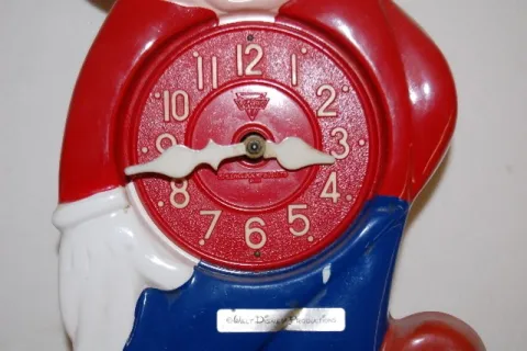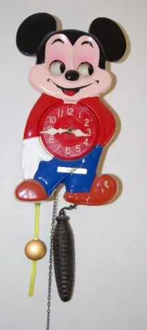 plastic with animated eyes; marked Mi-Ken Clock Mfg. Co. and Walt Disney Productions; has pendulum and pinecone weight. Not tested. 10 3/4"...