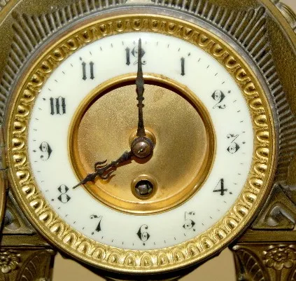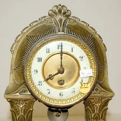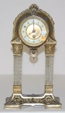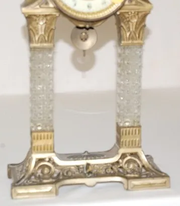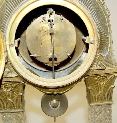 enamel chapter ring with plain center; TO; brass movement and pendulum marked Made in France; metal and glass decorative case. (Not running; finish we...