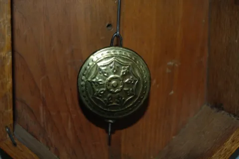 marked Ingraham painted tin dial; has pendulum; oak finish with mitered octagon sash; 8 day; TO; gilt decorated lower door. Not tested. (Dial stained;...