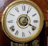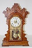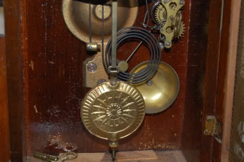 has pendulum and key; College Series; half hour strike with alarm; interior and exterior labels. (Gongs but wound tight.) 23"...