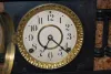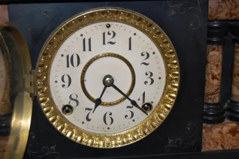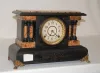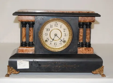 marked S.T. "Made in America" dial; has pendulum; marked S.T. brass movement; T and 1/2 hour gong strike; faux Carmel marble adamantine case with 2 pi...