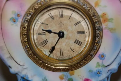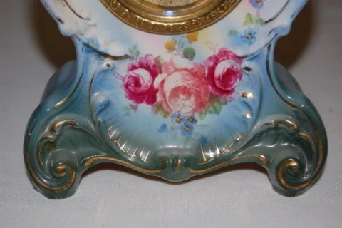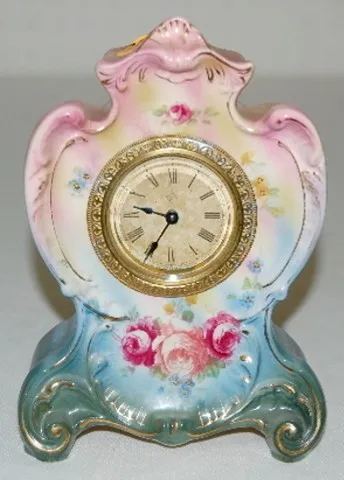 marked Ansonia paper dial; back of case marked Royal Bonn, FM 1755; "Agate"; key wind movement; beveled glass. Red rose decorated pink and blue case. ...