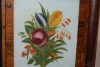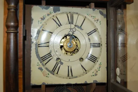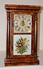 painted tin dial with alarm; T&S; weight driven; veneer with rosewood columns case; good interior label; floral painted door. Not tested. (No pendulum...