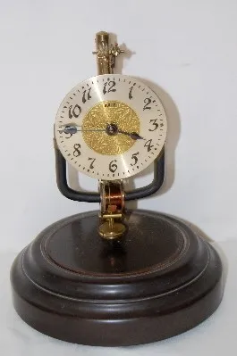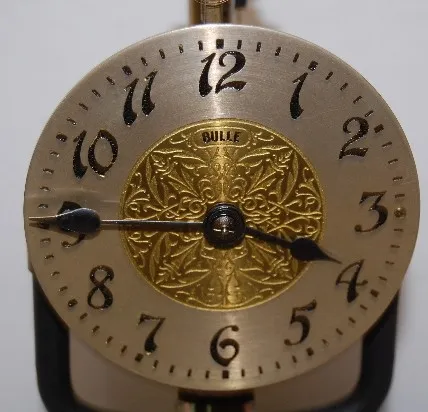 marked Bulle gold metal dial with embossed center; swinging pendulum; Bakelite base; looks to be complete. Not tested. (Minor nicks to rim of base.) 1...