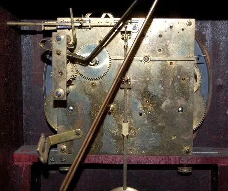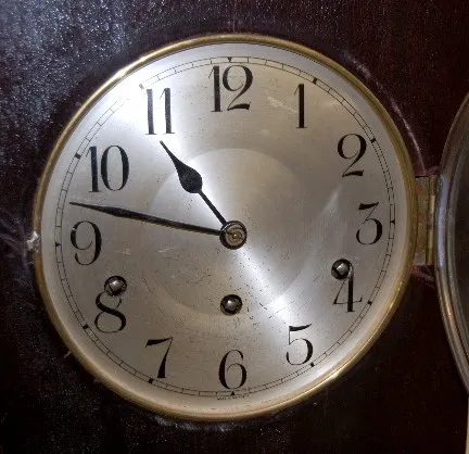 has pendulum; gold metal dial marked "Made in Germany"; 3 key holes; brass movement marked Kienzle with wings, Pat. Ang. No. 49549. (Wound tight; back...