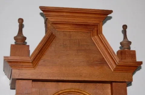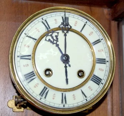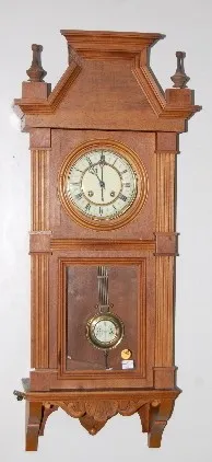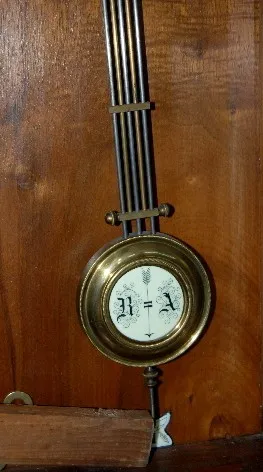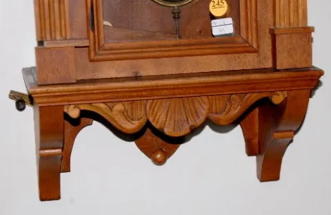 has pendulum & key; celluloid dial; T & S; movement marked 3 stars (Andreas Peter, Rottweil, Black Forest Germany. (Veneer damage.) Not tested. 32"...