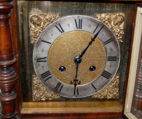 gold metal dial with lady head cartouche corners; has pendulum; T & 2 gong strike; movement marked with a rose and RSM 10542 2; beveled glass. (Wound ...