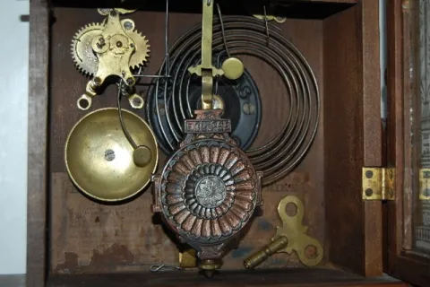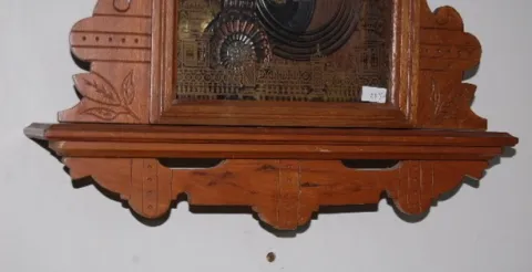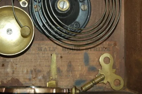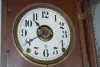 has Eclipse pendulum and key; paper dial; 8 day; T & S with alarm; half hour strike; gilt decorated door. (Wound tight; replaced dial; not running or ...