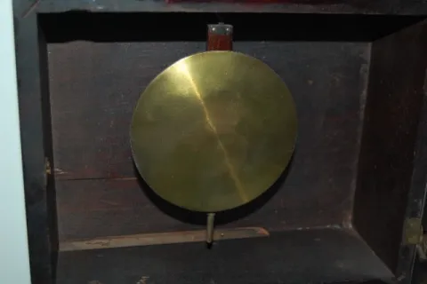 has pendulum; 8 day; TO; Ingraham paper dial; decorated throat; gilt and black door. (Dial yellowed; case somewhat rough.) Not tested. 39"...