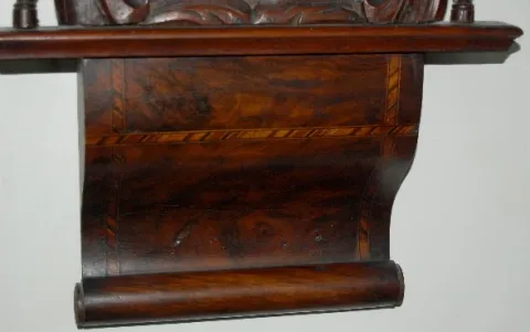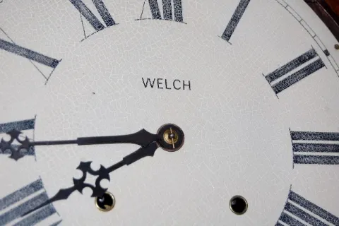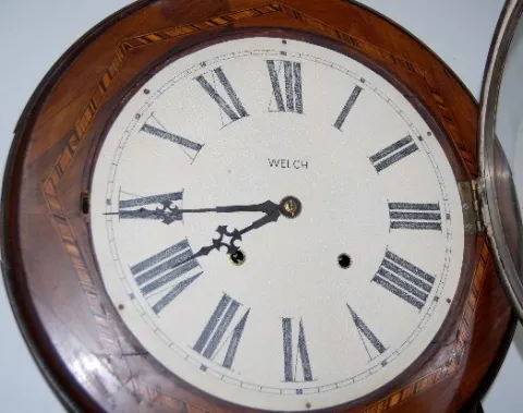 has pendulum; marked Welch painted tin dial; inlaid rosewood case. Not tested. (Some cracks in head plate.) 32"...