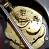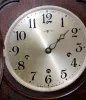 has pendulum and key; marked silver metal dial; 3 key holes; 5 bar strike; brass movement. (One hand is missing; winds but does not run.) 14 3/4"...
