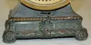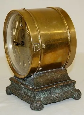 has pendulum and key; marked Seth Thomas painted metal face; marked ST brass movement; polished brass case on a white metal base. Running. (Small amou...