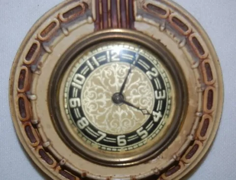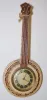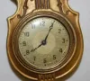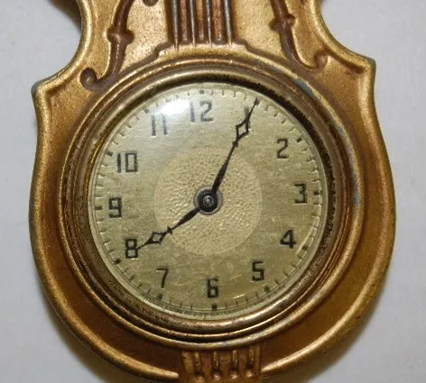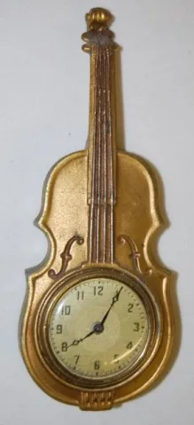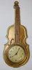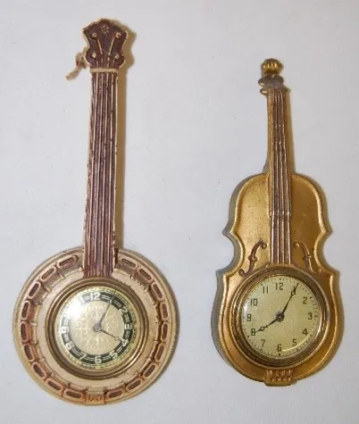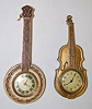1.) Lux, wooden banjo with gold and brown colored paper dial; marked on back Lux Clock Co.; running at this time. 2.) Unmarked Violin with gold paper ...