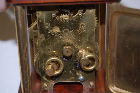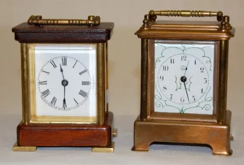 1.) wood and glass with a marked porcelain dial, 3 beveled glass panels; marked movement with fixed keywinders. (Bell strike on the bottom needs a bel...