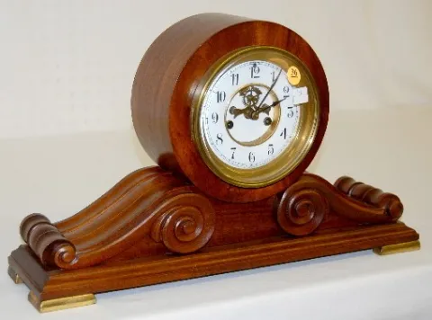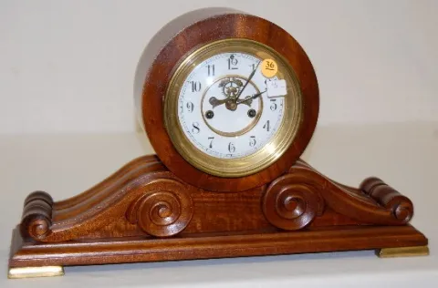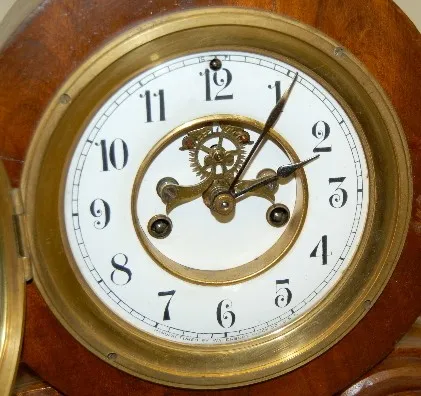 has pendulum; porcelain dial with visible movement; 8 day; half hour strike; mahogany finish; brass movement marked Waterbury. (Faint crack and chip b...