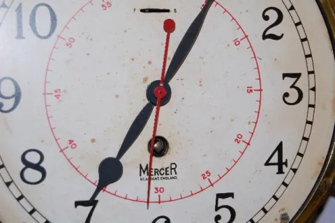 brass ship's clock mounted in an antique wooden ship's steering wheel; has the red 60 second grid. (Owner stated he put the clock movement into the sh...