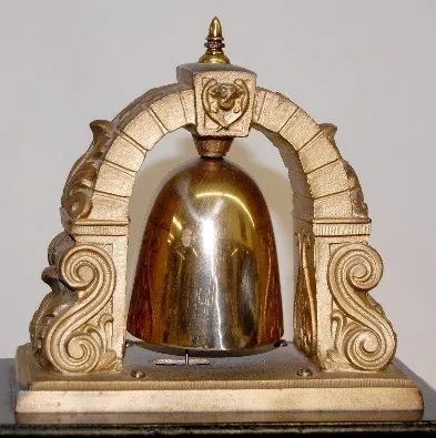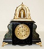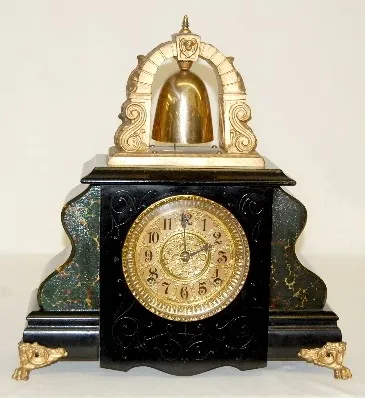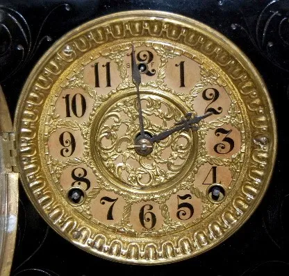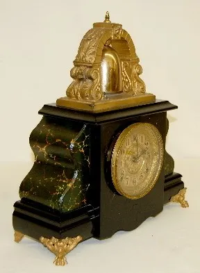 has pendulum; celluloid dial with filigree cover; brass movement marked G in a diamond and 1907. (Dial discolored; suspension needs fixed.) Running at...