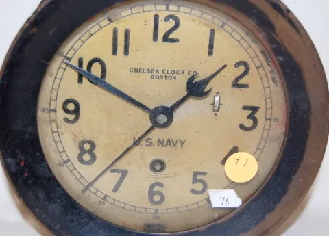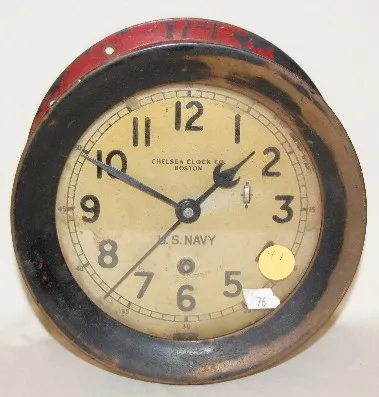 metal dial marked "Chelsea Clock Co., Boston and U.S. Navy"; TO; steel case. (Paint badly worn.) Not tested. 7 1/4" Dia."...