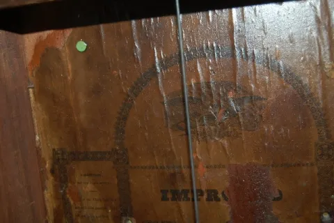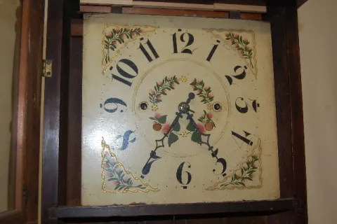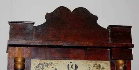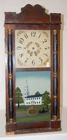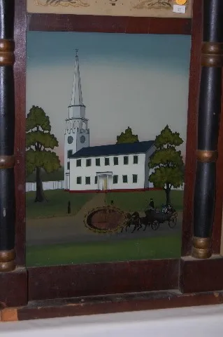Has pendulum; painted dial; painted church tablet., (No weights.) 36" T...
