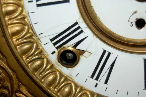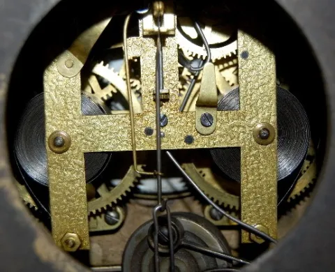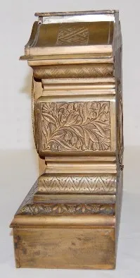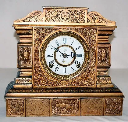 has pendulum; porcelain dial marked FK; embossed brass movement. Running at this time. (Dial damaged at 4 and 8; spring is wound tight.) 12 1/2" x 14"...
