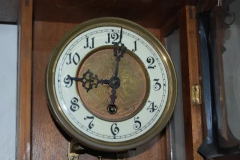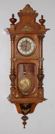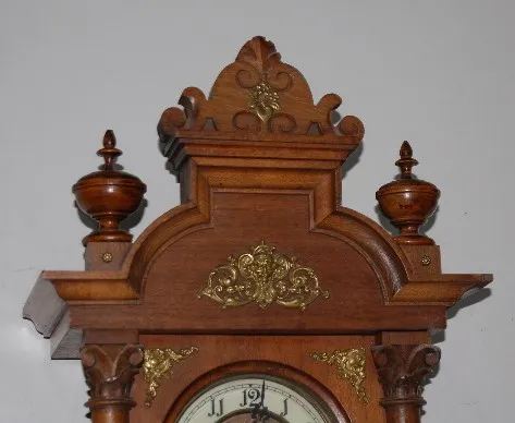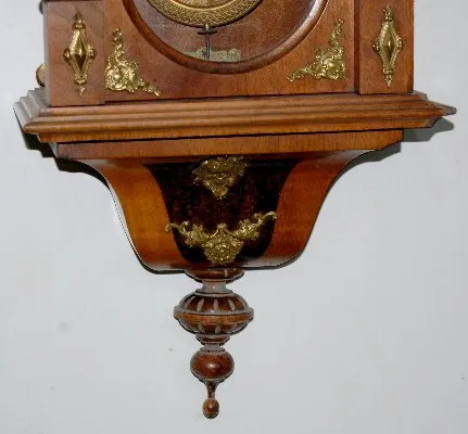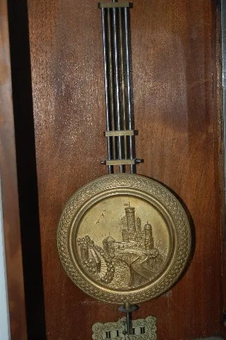 porcelain chapter ring with embossed center; TO; castle decorated pendulum; carved case with brass decorations including old man of the mountain face;...