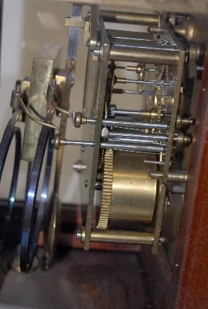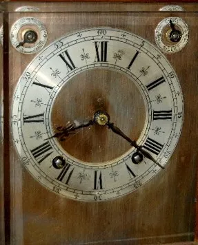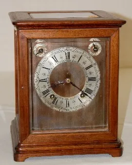 has pendulum; unmarked silver metal dial with Roman numerals; brass movement marked W & H in Sch Germany; wood and beveled glass case. (Front door loc...