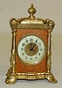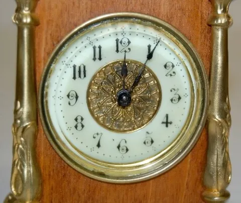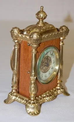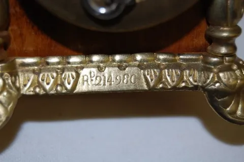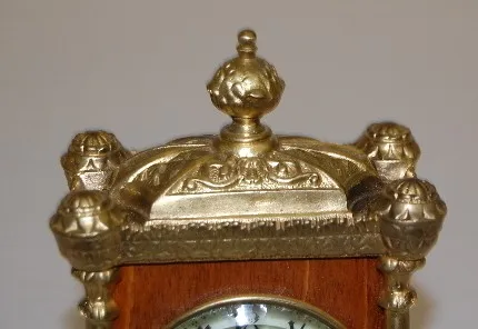 porcelain chapter ring with embossed center; wood panels with brass feet, top and trim; marked on back Pat. in Great Britain and France; MNF'd by the ...