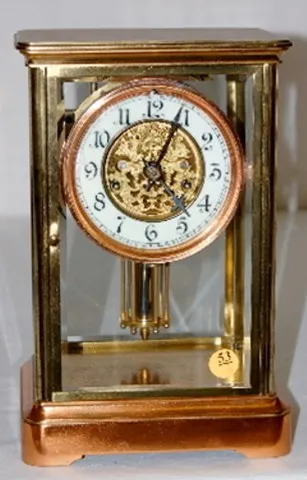 nickel and brass pendulum; porcelain dial with visible movement and filigree center; brass movement marked Waterbury; rich gold plated with copper pla...