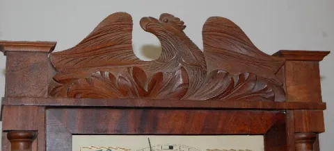 has pendulum and weights; 8 day, gong strike; carved columns and crest. (Top glass in door is missing.) 32"...