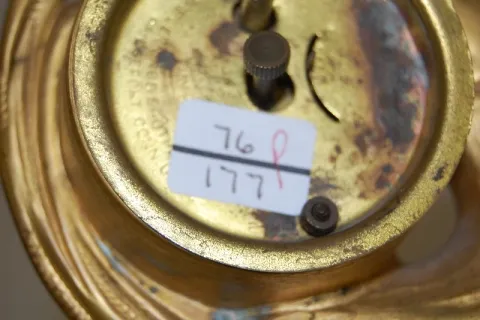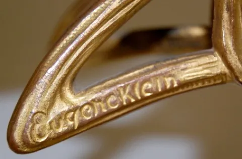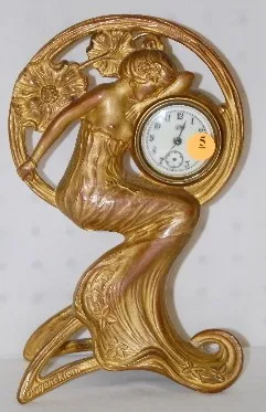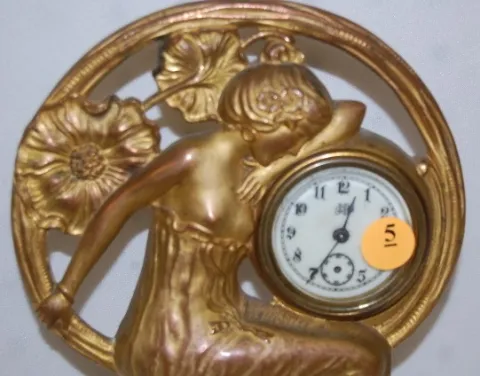 the case with lady figure and poppies is signed Eugene Klein. (Has no hands, no key, some finish wear; is not running at this time.) 10 1/4"...