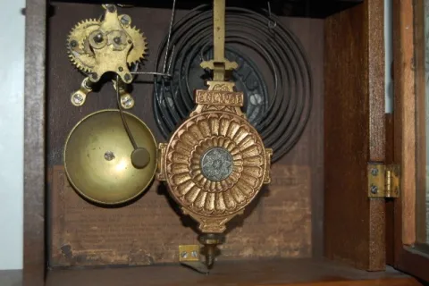 has pendulum; Seth Thomas paper dial; T & S with alarm. (Dial discolored.) Not tested. 26 1/2"...