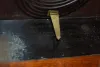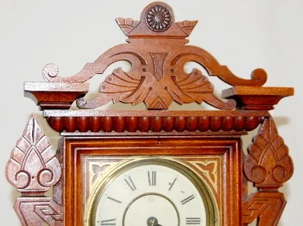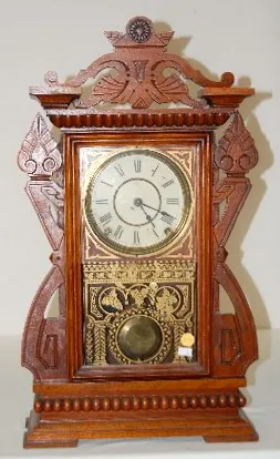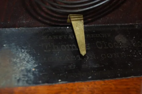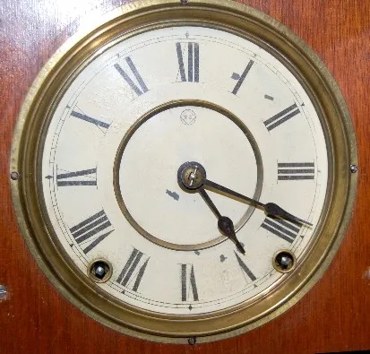 S.T. painted tin dial; T & S; has pendulum; interior paper label. (Not running; dial is crazed and chipping; case has small areas of roughness.) 24"...