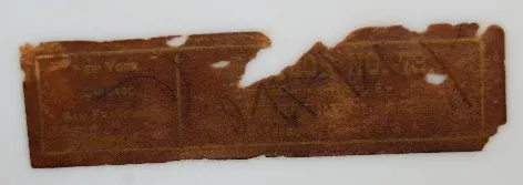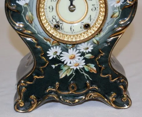 has pendulum and key; porcelain dial; marked Waterbury movement; case decorated with white daisies on green. Running and gongs. (Dial damaged by 7 & 8...