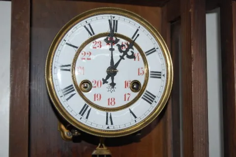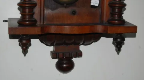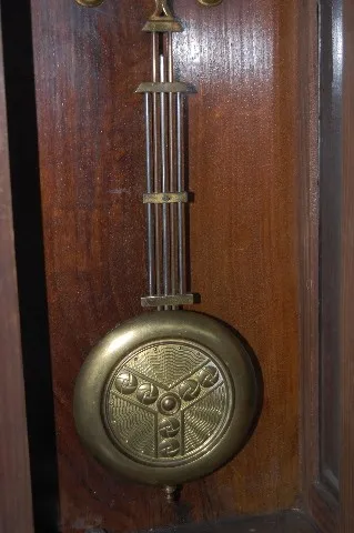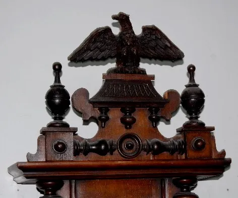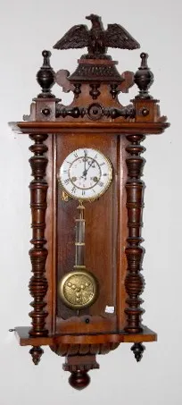 5 1/2" - 24 hour dial; case has a spread winged bird on the top; has embossed pendulum. (Hour and half hour strike are reversed.) Running. 44 1/2"...