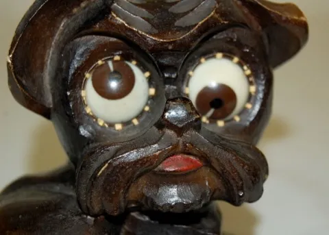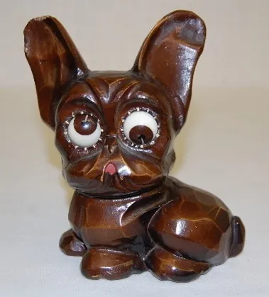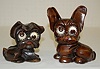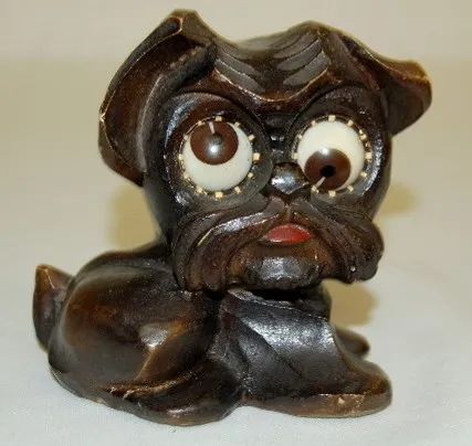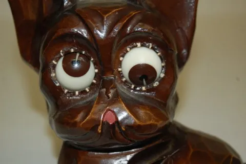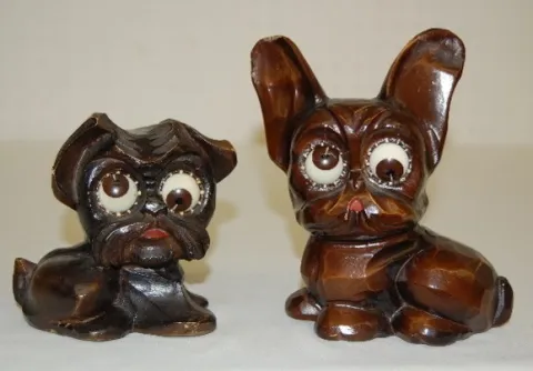 both have animated eye dials; carved dog cases; one has the paper S label on the bottom; fixed key wind movement. (Shortest = no paper label; wear to ...